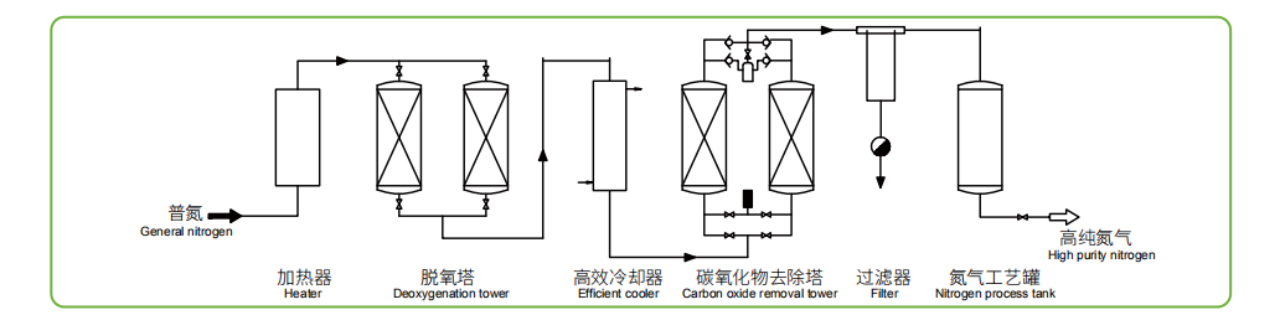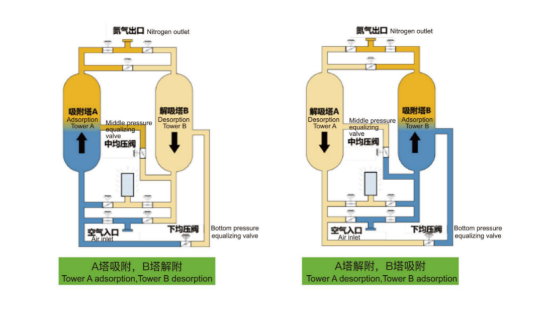 The clean compressed air enters from the bottom of the adsorption tower filled with carbon molecular sieve, and after the air flow diffuses through the equalizer diffuser with a special structure, it evenly enters the adsorption tower for oxygen and nitrogen adsorption separation, and then produces high-purity nitrogen from the top of the adsorption tower and sends it to the nitrogen process tank for storage; A small amount of finished nitrogen enters the regeneration tower to purge the carbon molecular sieve to remove the adsorbed oxygen to achieve regeneration. The two adsorption towers operate alternately in cycles, continuously feeding raw material air to continuously produce nitrogen.